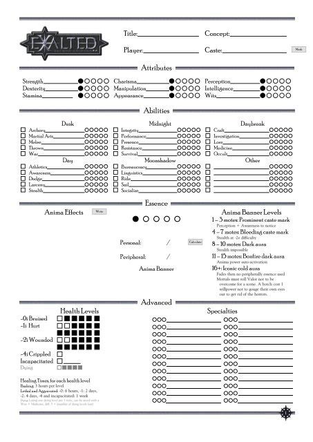 Exalted Character Sheet. Heyo friends, i got some good. A general character sheet usefull for creating terrestrial exalted pcs and.