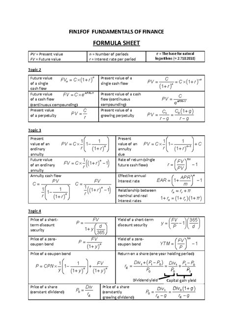 Formula sheet Princ of Finance