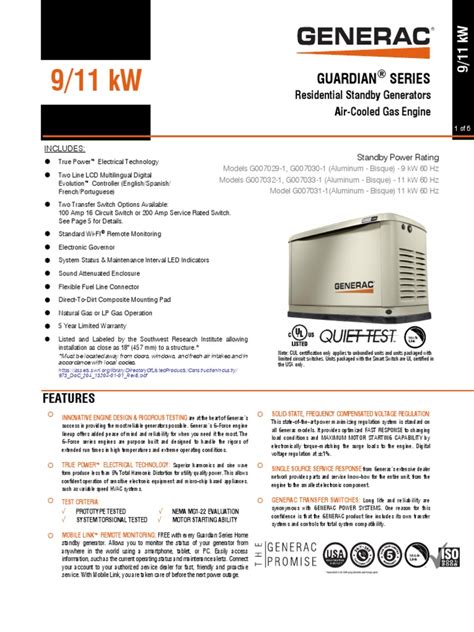 Generac Spec Sheet 9kw and 11kw Electric Generator Battery