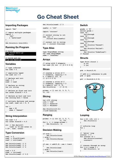 Go Language Cheat Sheet. Web go cheatsheet # getting started introduction a tour of go (tour.golang.org) go repl (repl.it) golang wiki (github.com) hello world.