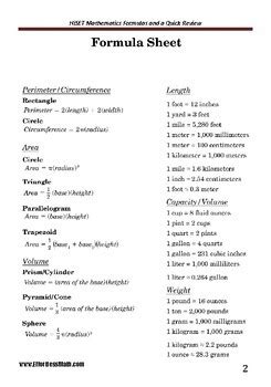 Web all of the formulas and conversions that you will need on the hiset math test are included in the second half of this page. Web formula sheet perimeter / circumference rectangle perimeter = 2(length) + 2(width) circle circumference = 2t(radius) area.