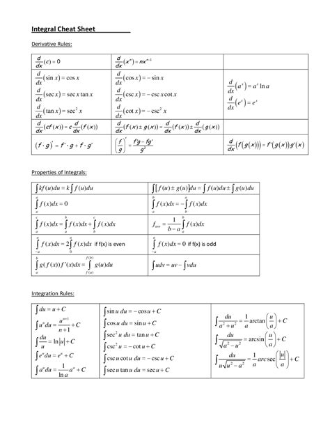 Integral Rules Cheat Sheet. Web comparison test for improper integrals : β«π₯β1 π₯=ln(π₯) β« π₯ π₯ =ln(π₯) β« |π₯ π₯=π₯βπ₯ 2 2 β« π₯ π₯= π₯ β«sin(π₯) π₯=βcos(π₯) β«cos(π₯) π₯=sin(π₯).
