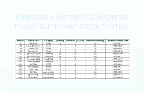 Maintenance Inventory Spreadsheet in Sheetory Example Samples