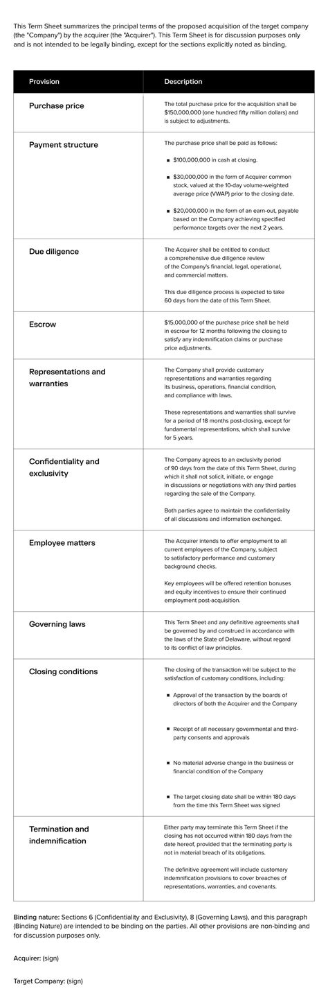 M&A Term Sheet. Web the term sheet is a short bullet list of the key points of the transaction, such as the selling price, earnest money deposit, down.