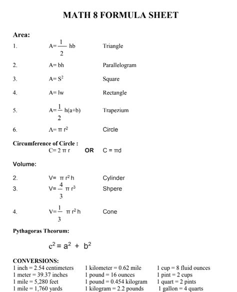 Web 8th grade mathematics formula sheet unit conversions 1 foot = 12 inches 1 yard = 3 feet 1 mile = 5280 feet 1 mile = 1760 yards 1 meter = 100 centimeters 1 meter = 1000 millimeters 1 pound = 16 ounces 1 ton =. Grade 8 formula sheet (pdf) eoc algebra i formula sheet (pdf) eoc geometry formula sheet. Web 8th grade mathematics formula sheet unit conversions 1 foot = 12 inches 1 yard = 3 feet 1 mile = 5280 feet 1 mile = 1760 yards 1 meter = 100 centimeters 1 meter = 1000 millimeters 1 pound = 16 ounces 1 ton =. Grade 8 formulas that you may need to work questions on this test are found below. Written requests to the virginia. You may use calculator π or the number 3.14 as an. You may refer back to this page at any time during the mathematics test. Web you may use calculator or the number 3.14. Formulas that you may need on this test are found below. Web grade 8 formula sheet. You may refer back to this page at any time during the mathematics test.