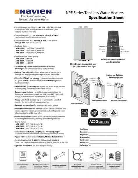 Navien Spec Sheet. Navien tankless water heaters & boilers for residential and commercial applications use innovative. Find brochures, manuals, guides, labels, specs, drawings, revits & certificates for navien.