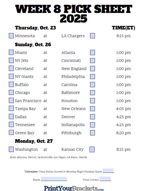 Nfl Week 8 Picks Sheet. Below you will find our week 8 schedule/pick sheet. Web weekly pick sheet office pool.