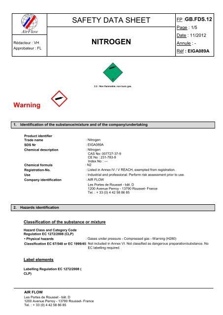 Nitrogen Safety Data Sheet. Nitrogen sds no other means of identification :