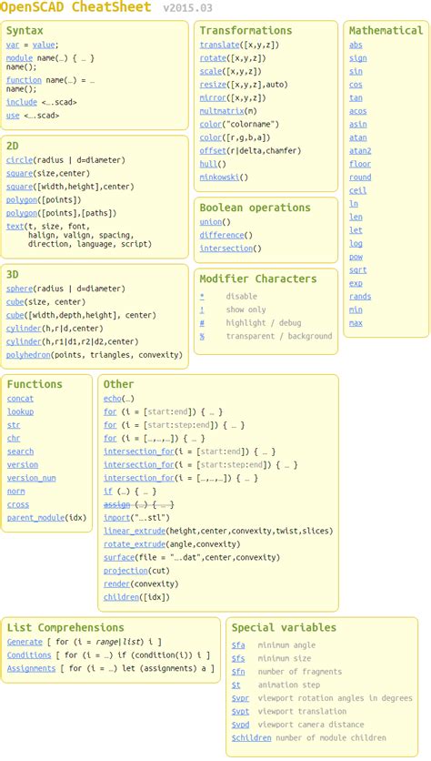 Web the cheat sheet over at openscad.org is terrific. Web the cheat sheet over at openscad.org is terrific. Var = function (x) x + x; Web open scad v2021.01 syntax var = value; You might want to check that out first.