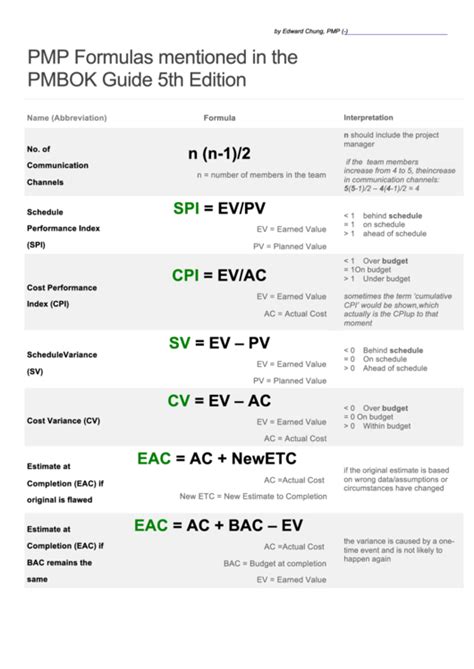 PMP Formulas Cheat Sheet PDF Business