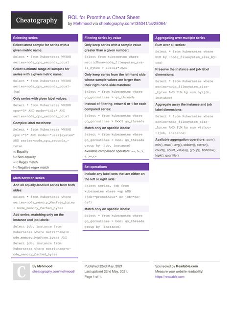 Prometheus Cheat Sheet. Web promql cheat sheet selecting series select latest sample for series with a given metric name: