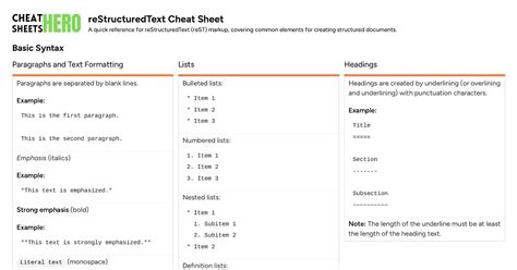 Restructuredtext Cheat Sheet. Web this cheat sheet explains how to use common restructuredtext formatting with the sphinx documentation generator.