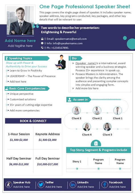 What design elements are key to a solid speaker one sheet. If you’d like to create a one sheet, we’ve got a template that you can use and download and easily print off, and. Explain how your clients will benefit from hiring you. How to balance design with communicating information. How many images and testimonials to include on your sheet. Web you don’t have a ton of design skills, so creating one from scratch seem very difficult. Explain how the audience will benefit from your presentation. Remember, a speaker one sheet is used in. What is a speaker one sheet?
