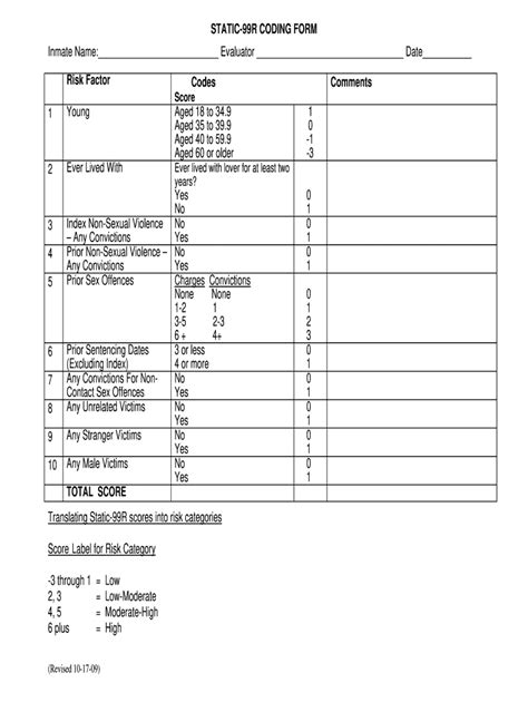 Static 99R Score Sheet. Web there was exact agreement in total scores on 1,255 (63.6%) of the cases, though a small number of cases (n= 90) achieved.