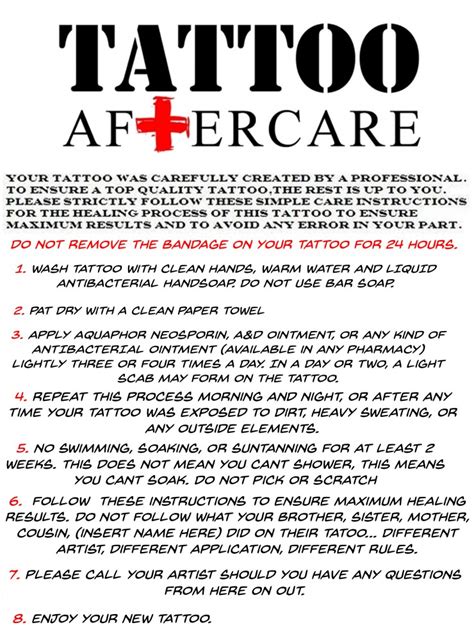 Web make sure you bookmark this page so you can come back to our tattoo aftercare instructions sheet whenever you. Web day 1 you’ll come home from the tattoo studio with a dressing over your tattoo. Once your tattoo is complete, your tattoo. Web learning the tattoo aftercare rules and understanding the healing process depends on the size of your tattoo and the intricate. Your artist should tell you how long.
