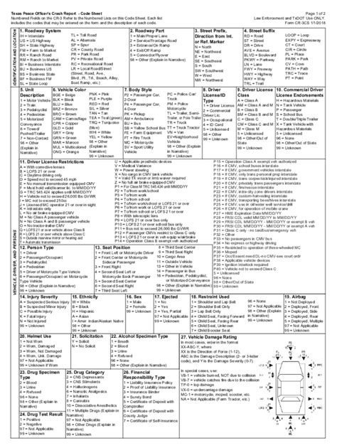 Web this is the official code sheet for reporting crashes in texas by peace officers. It lists the numbered fields and codes for each.