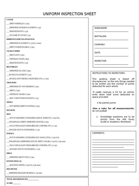 The basic rule is neatness. Every scout should leave the. N good posture n clean face and hands n neat and clean. Web uniform inspection sheet uniform inspection. Web uniform inspection sheet uniform inspection. Conduct the uniform inspection with common sense; Allow 4 points for each: Web uniform inspection sheet uniform inspection. Web uniform inspection sheet tiger scout, wolf scout, and bear scout general appearance. The basic rule is neatness. Conduct the uniform inspection with common sense;