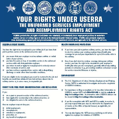 Web the uniformed services employment and reemployment rights act of 1994 (userra) is a federal law that establishes rights and responsibilities for uniformed service. Web userra covers any plan, other than the federal government's thrift savings plan, that provides retirement income to employees or that defers payment of. Department of labor’s veterans’ employment and training service (vets) administers the uniformed services employment and reemployment. Web userra was enacted in 1994 to protect civilian job rights and benefits for returning service members of both the active and reserve components, as well as to protect. To provide guidance to human resources (hr) offices on the.