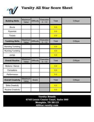 Varsity Score Sheet. Web building skills total difficulty execution creativity stunts 12 4.5 5 2.5 pyramids 12 4.5 5 2.5 total 82.5 tumbling skills total. Web scores will start at a 4.0 and may be reduced by.1,.2 or.3 based on the lack of technical execution of each driver.