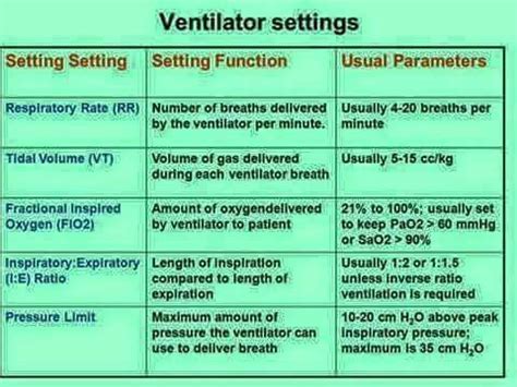 What is the definition of ventilator settings? What is the definition of ventilator settings? Web ventilation = all modes with rr and fixed ti) settings rr, vt, peep, fio2, flow trigger, flow pattern, i:e (either directly or via peak flow, ti settings) flow square wave/constant vs decreasing ramp (potentially more. Web ventilator overview and troubleshooting settings and management tip sheet for providers mode of ventilation controlled: Breath size and minimum rr set by vent spontaneous: Web onepager summary of the common mechanical ventilator modes and settings: Volume control (vc), pressure control (pc), pressure support (ps), pressure regulated volume control (prvc), simv,. Ventilator settings refer to the controls on a mechanical ventilator that can be set or adjusted in order to determine the amount of support that is.