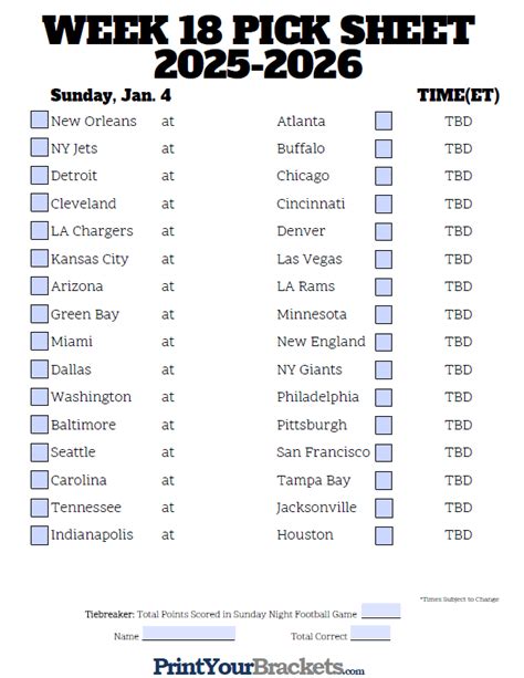 Week 18 Pick Em Sheet. Below you will find our week 18 schedule/pick sheet. 2021 nfl week 18 name: