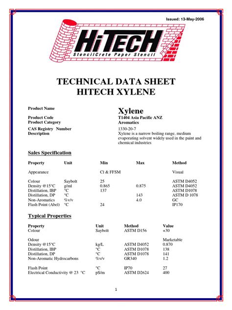 Xylene Product Data Sheet. Property acidity aniline point api gravity benzene content. Web product description xylene (ch3)2c6h4 meets astm d843 requirements for nitration grade.
