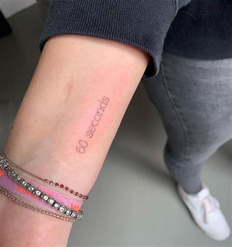 "60 seconds" lettering tattoo on the wrist.