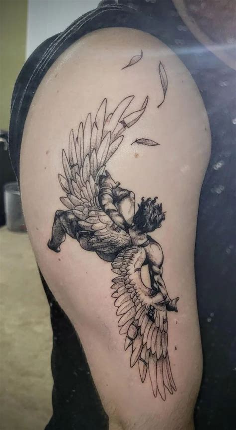 Icarus upper arm Icarus tattoo, Grey tattoo, Black and grey tattoos