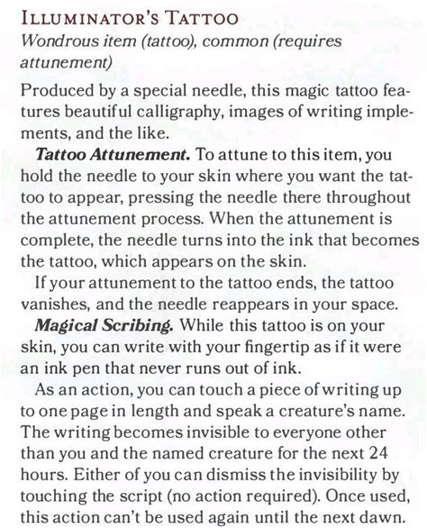 Illuminators Tattoo 5E. Web posted by joab | jan 23, 2021 | for players, rules & mechanics | 3 magic tattoos are one of the most interesting magic items. Wondrous item (tattoo), common (requires attunement).