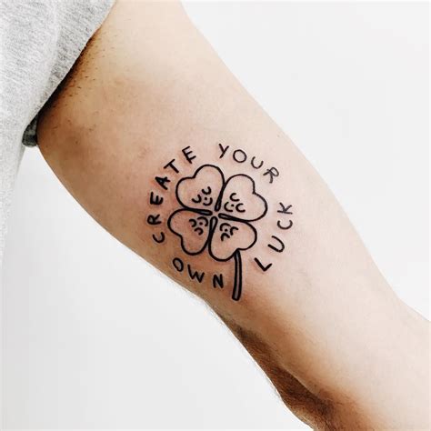 Minimalist shamrock and words ‘Create your own luck’ tattoo inked on