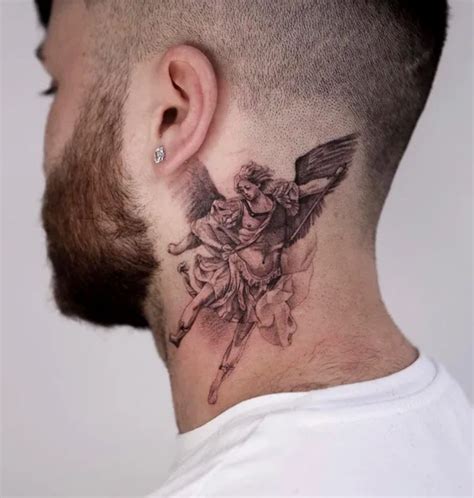 Saint Michael Neck Tattoo. The traditional designs feature roses, a heart pierced by a knife, a verse from prayer, the. The tattoo being of a small.
