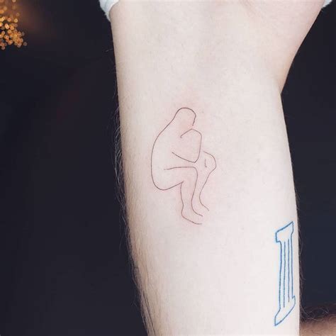 Minimalist "The Thinker" tattoo on the inner arm.