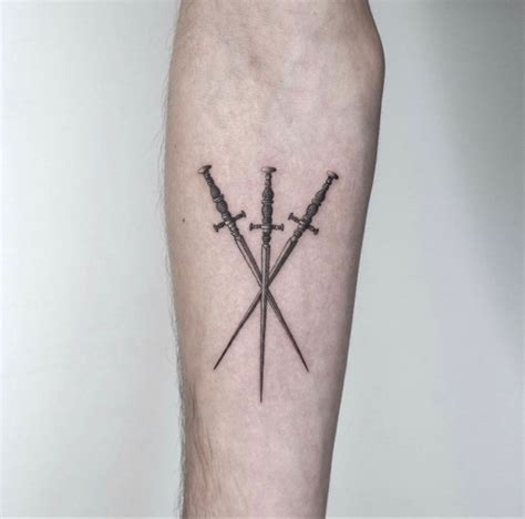Three Sword Tattoo. Web the number three has a special significance in sword tattoo designs. Web the three swords tattoo's many variations and interpretations, as well as its extensive meaning and history, will be.