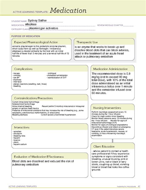 Alteplase Medication Template. Drug for dissolving clots / pharmacologic class: Lysis of thrombi and restoration of blood flow.
