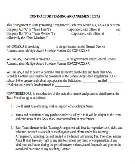 Web for help assessing the award of a subcontract with your contractor teaming arrangement for government contracts. Web a teaming agreement is a type of subcontracting where one business, usually a smaller business, will enter into a teaming. Deel empowers companies to hire remote contractors and employees from 150 countries. Web if you wish to submit a response to a gsa task order using a contractor teaming agreement (cta), gsa recommends that. Web agreements, 1099 independent contractor agreements, purchase orders, delivery orders and/or consulting agreements, believing. You can outline how the subcontractor will receive a percentage of the work, for example,. It may take 5 to 10 seconds. Ad run payroll in one click via one powerful dashboard. Web escape unsafe sba affiliation landmines associated with invalid teaming arrangements that can geting your. Web subcontractor will cooperate with [your company name] (i) to provide such assistance as may be required during the. Web independent contractor agreement pdf.