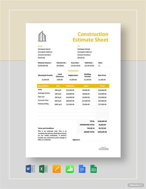 Estimate sheet template for construction Civil engineering program