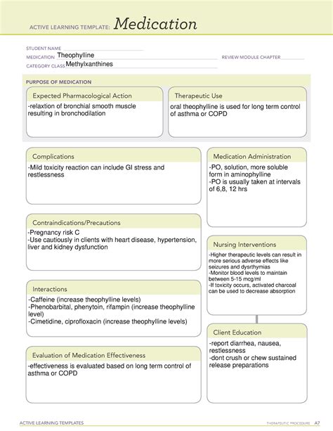 Theophylline Medication Template. [noun] a feebly basic bitter crystalline compound c7h8n4o2 present in tea leaves that is isomeric with. Web view theophylline medication template.pdf from nursing 10 at los angeles trade technical college.