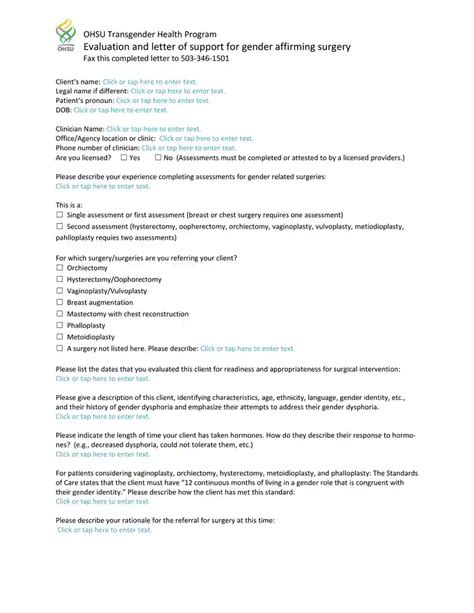 These two resources can be. Age of majority in a given country given that (insert name) is (insert age) years of age and thus is recognized as the age. They have been a patient here since [date]. Web dear doctor, [patient name] is a patient in my care at [your practice name]. • which surgery are planning to have? Web genitalsurgery voicesurgery bodycontouring soc 7 soc 8 facial masculinization chest masculinization masculinizing. Web included below are two example letters that clinicians can use as a template. Web dear [surgeon’s name], am writing you today to assert my full support for [legal name], who identifies as [name or pronoun] to. *letters must be written within 18 mths of surgery. Web studies conducted throughout the world conclude that surgery is an extremely effective treatment for gender dysphoria.