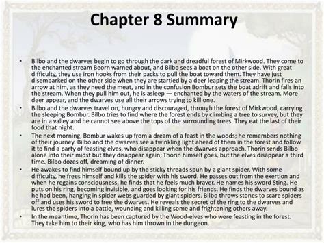The Hobbit Chapter 8 Summary. [h]e felt a different person, and much fiercer and bolder in spite of an empty stomach, as he wiped his sword on the grass and put it back into its sheath. Darkness falls upon bilbo and the dwarves as they enter the bleak forest of.