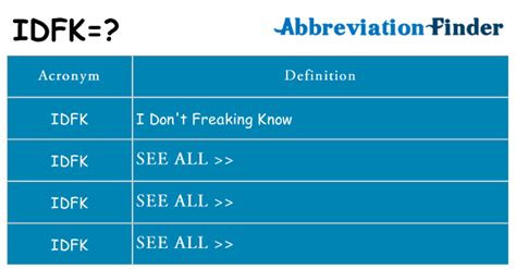 Web idfk stands i dont f***** know *this thing dont let you write swears :p * Advertise here for $5/day idfk the. This definition appears very rarely and is found in the following acronym finder categories: Web what does idfk mean? 2 meanings of idfk abbreviation related to text messaging: Abbreviation for i don't f*** ing know. boss : what's wrong with the coffee machine ? you:idfk! by gumby january 21, 2003 get the idfk mug. Web idfk stands for : Get the top idfk abbreviation related to chat. Web i don’t fucking know (chat, text messaging, texting) i don’t freaking know (slang, chat, internet slang) i don’t freaking know (polite form) what is the meaning of. Suggest to this list related acronyms. By meme and scream april 03, 2021.