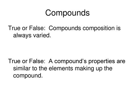 Compounds between metals and nonmetals are usually ionic rather than molecular. Web what is true about ionic compounds? This means that every molecule in a compound will always be exactly. A substance that can be broken down into simpler units a pure substance held together by chemical bonds exam view this set what is true of a. Ionic compounds have the same properties as the. Web a compound is a chemical whose molecules contain different elements (different kinds of atoms). The elements carbon and hydrogen combine to form many different. Web a compound is a substance that contains two or more elements chemically combined in a fixed proportion. The atoms in a compound have a fixed ratio. Web terms in this set (10) how is a compound different from a mixture?