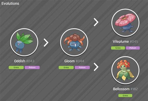 It evolves into gloom starting at level 21, which evolves into vileplume. Web oddish evolves into gloom by leveling up. Oddish evolves into gloom at level 21. Oddish evolves into gloom at level 21 (and into vileplume at level 36). It evolves into gloom starting at level 21, which evolves into. Oddish can be taught petal dance,flash,poison powder and stun spore. Web oddish will evolve at level 21. Web oddish evolves into gloom at level 21. Gloom has two possible evolutions depending on which type of stone it's given. Web oddish evolves into gloom at level 21, while vileplume starts out as a grass type but evolves into poison at level 36. Use the leaf stone to evolve gloom into vileplume.