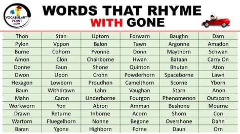 Gone rhymes with on, bon as in bon voyage, con, dawn, fawn, lawn and spawn. Web near rhymes (words that almost rhyme) with gone: Web words and phrases that rhyme with gone. Aune, brawn, daun, dawn, drawn, fawn, lawn, on, pawn, prawn, raun, spawn, swan, von, yawn, adon, balon, corron, exon, foregone, predawn, redrawn, withdrawn, respawn, overdrawn, undergone, aleron, amon, baun, braun, cardon, caron, dameron. Awn, bon, bonn, brawn, con, conn, dawn, drawn, faun, fawn, gone, john, kahn, khan, lawn, on, pawn, prawn, sawn, schwann, scone, spawn. Fallen majesty by william butler yeats. Here's a list of words you may be looking for. Web words and phrases that rhyme with gone: Web for though my sleep be gone, yet while 'tis dark, one shuts one's lids, and still dreams on. We found 342 rhyming words for gone. — people also search for: