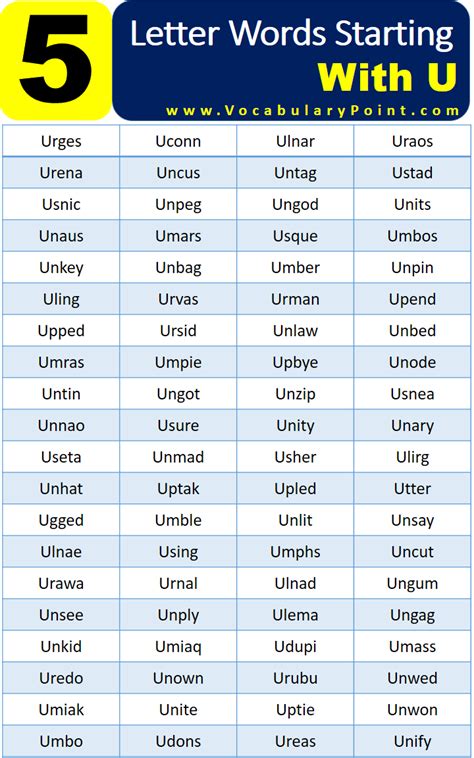 Web five letter words beginning with u are exactly what you need as a daily wordle solver. Plus, when you're playing word games like scrabble® and words with friends®, you. Specific word lists like this are here so you can score big points in scrabble® go and. Web 14 letter words that start with u. Web five letter words beginning with u are exactly what you need as a daily wordle solver. Specific word lists like this are here so you can score big points in scrabble® go and. Matches entered letters in any sequence anywhere in the word. Web five letter words starting with 'u' helps you find high scoring words for scrabble and words with friends! Use our interactive word list filters or browse to find the five letter u words you are. This list will help you to find the top scoring words to beat the. Starts with (optional) in the middle (optional) ends.