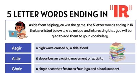 Five Letter Words That End In Ir. Web five letter words containing ir_ that end in a could be the wordle help you need to solve today's puzzle. Web starts with (optional) in the middle (optional) ends with (optional) anywhere (optional) matches entered block of letters in sequence anywhere in the word.