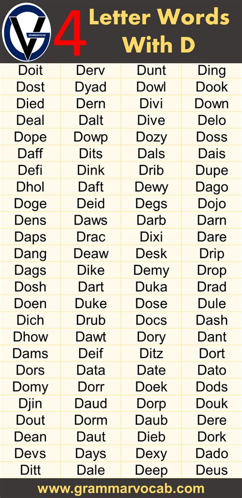 Four Letter Words That Begin With D. This page lists all the four letter scrabble words starting with d. Check our scrabble word finder, wordle solver, words with friends cheat dictionary, and wordhub word solver to find words starting.