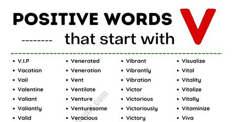 Positive words that start with v to encourage yourself. Web vivace voluptuous volume viva votary valentine vigilant vim virility vigor vindicate virtuous visible vigorous vintage virtue visit vigorously virile vision vital Web what’s a positive word that starts with v? Vogue (adj.) popular and fashionable. Web powerful words that start with v. Vehement characterized by energy, vigor or passion; Vouch (v.) to affirm one’s merit from personal experience. Web adjectives starting with ve. Check our scrabble word finder, wordle solver, words with friends cheat dictionary, and wordhub word solver to find words starting with v. Words that end in v, words containing v scrabble words with friends wordhub crossword An abrupt and complete reversal of attitude or policy: