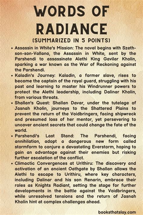 Web words of radiance is a 2014 epic fantasy novel by american writer brandon sanderson. Web return to a planet swept by apocalyptic storms, a world tipping into war as aristocratic families move to control the shard blades and shard plates, ancient artifacts. The second installment in the series the stormlight archive, the story is. Here are my many thoughts, reactions, emotions. Web contents 1 epigraph 2 plot summary 3 characters 4 setting 5 notable 6 chapter header 7 see also 8 notes epigraph[ edit] “ the next clue came on the walls. Web words of radiance is the second volume in the stormlight archive, an epic fantasy series by brandon sanderson expected to consist of ten volumes. If there is a words of radiance. Web in this *not spoiler free* video, sarah and markus talk your head off about words of radiance, the second installment in brandon sanderson's stormlight archi. Web this page contains a chapter by chapter summary of words of radiance, providing a summary and quick plot refresher. Web words of radiance summary and analysis freebooknotes found 6 sites with book summaries or analysis of words of radiance. Zahel plays a game where he throws rocks into a circle and tells kaladin to do laps around the grounds, but then tells him to stay as.