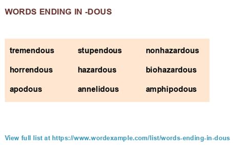 Web here's the list of all the 48 words ending with dousin the english language. Web we have listed 157 words that end with dous for you in this wordmom word list. The four incredible words ending in dous: Here is a list of words from our site that end in dous. Web words that end in 'dous'. Click on the length below to jump to the relevant section of the page. Scroll down to see words with fewer letters. Words that start with dous, words containing dous scrabble words with friends wordhub. The fourth common word you're looking for is hazardous, but we can do better than four words! Web found 82 words that end in dous.