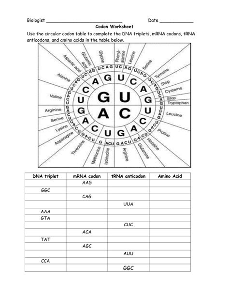 1 codon = a single amino acid; A codon is a sequence of three bases (letters) found on the mrna strand. Web for the audio version of the file, click this link: Which codon is start codon for all proteins? How many codons are there in the codon table? Name all the codons for these amino acids: To decode a codon, start at the middle of the circle and move outward. Using the above mrna codon/anticodon triplet codes as well as the chart at the bottom of the page, identify the amino acids coded for by this sequence. Web codon worksheet instructions use the circular codon table to complete the dna triplets, mrna codons, and amino acids in the table below. Name all of the codons for these amino acids: